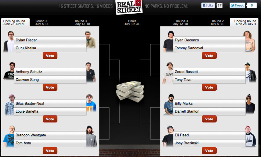 ESPN hat alle "X-Games Real Street" Contest Clips veröffentlicht. Wer gewinnt 50.000 $ für einen 60 Sekunden Part? Daewon Song, Billy Marks,Zered Bassett, Dylan Rieder, Guru Khalsa, Anthony Schultz, Silas Baxter-Neal, Louie Barletta, Brandon Westgate, Tom Asta, Ryan Decenzo, Tommy Sandoval, Tony Tave, Darrell Stanton, Eli Reed und Joey Brezinski nehmen an dem Contest teil.