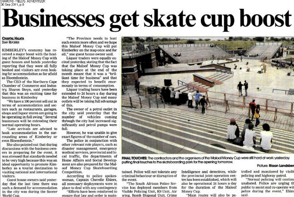 Hotels, Apartments und Gästehäuser meldeten eine 100%ige Auslastung ihrer Zimmer, das gab es, wie schon oben erwähnt, seit der Fußballweltmeisterschaft nicht mehr. Selbst in Nachbarstädten wie Bloemfontein macht sich der Skateboardevent bemerkbar.