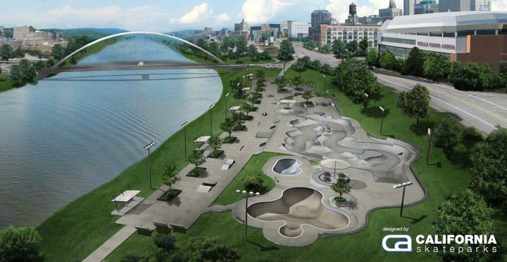 The Des Moines Skatepark Committee and California Skateparks collaborated to create a World Class skatepark in Des Moines that is set to be one of the largest in the nation totaling more than 65,000 Sq. Ft. The City of Des Moines Iowa donated a beautiful parcel of land located along the Des Moines River adjacent to School St. and 2nd Ave. The park will be built over the existing West River Drive and incorporate an extension of river walk, giving pedestrians an option to travel through the passive part of the skatepark. The nearby pedestrian bridge spanning the river adds an additional element to the setting enhancing the interest of the skateparks location. The bridge will also serve as another route to the skatepark from down town. Centrally located to downtown and the freeway, The Des Moines Regional skatepark will be a welcome addition to the network of parks in the city.