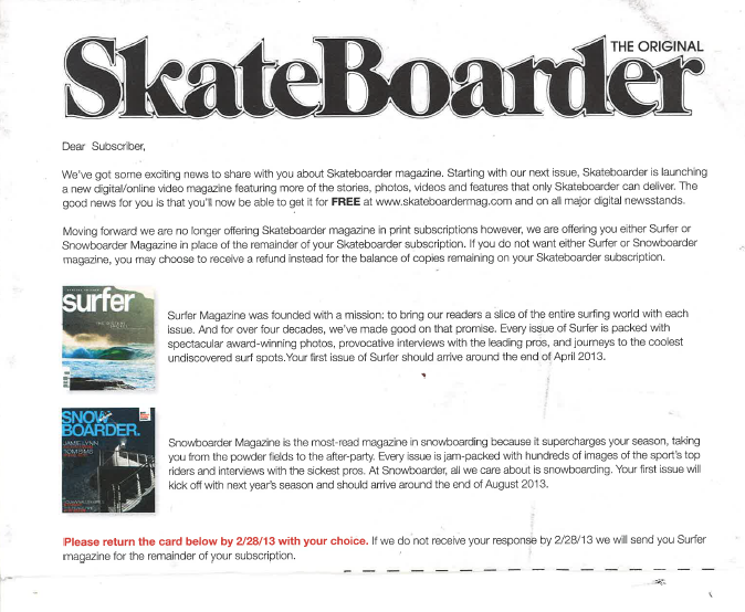 Das US-Magazine "Skateboarder Mag" hat seinen Abonnenten ineinem Brief mitgeteilt, dass man die Print Version einstellen wird. Den Schwerpunkt will man auf den Onlinebereich verschieben, aus dem Skateboard Mag soll ein reines Online Magazine werden.