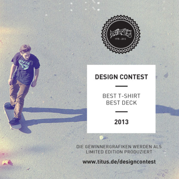 Alle Jahre wieder… fordern wir die Titus-Kunden auf, uns die kreativsten Deck- und T-Shirt-Designs zukommen zu lassen! Einsendeschluss für das selbst kreierte Lieblingsteil ist der 28.04.2013. Designvorlagen stellen wir den kreativen Köpfen auf www.titus.de/designcontest zur Verfügung.