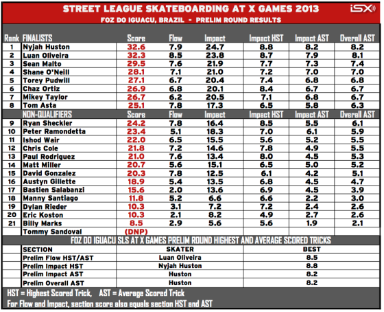 Unter den Ergebnissen gibt es Practice Footage von Nyjah Huston, Eric Koston, Sean Malto und David Gonzalez. Das Finale steigt dann heute, siehe Live TV-Übertragung.