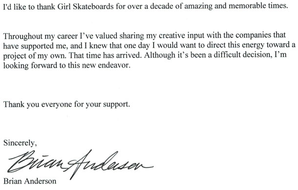 Nach ca. 10 Jahren hat Brian Anderson seinen Sponsor Girl Skateboards verlassen. Brian will eine eigene Firma aufbauen. Checkt Brians Kommentar per Klick oben auf das Bild ab.