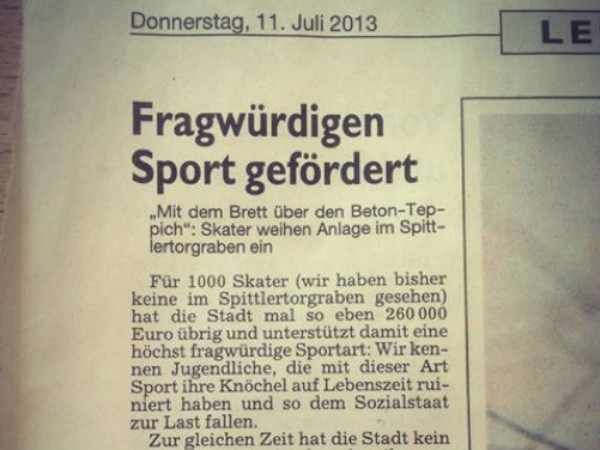 Bernd und Christine Nötzig aus Nürnberg beschweren sich in einem Leserbrief über den neuen Splitterskatepark in Nürnberg und behaupten, das Skateboarding eine fragwürdige Sportart sei.