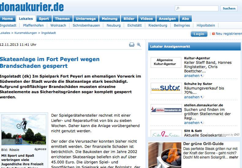 Unbekannte Täter haben sich einen Spaß daraus gemacht den Skatepark von Ingolstadt, im Spielpark Fort Peyerl, in brand zu stecken. Wie der Donaukurier berichtet, wurde dabei der Skatepark stark beschädigt.