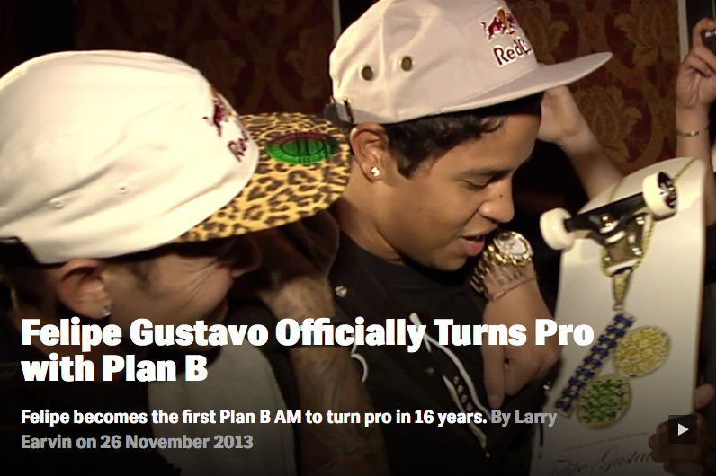 Seit 16 Jahren gab es keinen Amateurfahrer bei Plan-B Skateboards, der zum Pro Fahrer ernannt wurde, bis Felipe Gustavo kam. Nach dem Pro Part folgt jetzt ein Red Bull Clip von der "Felipe turns pro" Party.