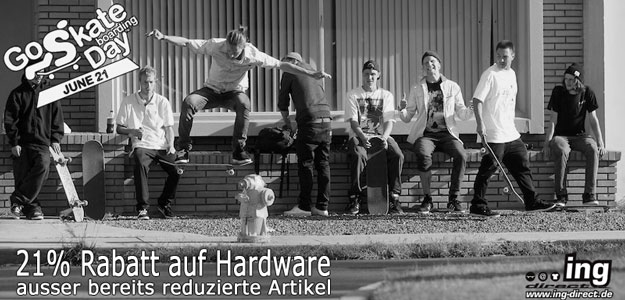 Leider etwas kurzfristig, aber ich hoffe, ihr seht es trotzdem: Am Sonntag, den 21.06. ist für die meisten Menschen Sommeranfang, für uns Skater ist weltweiter GO SKATEBOARDING DAY! Zur Feier unseres Tages, gibt es bei ING DIRECT heute und morgen 21% Rabatt auf die komplette Hardware! Egal ob Decks, Achsen, Rollen oder sogar Komplettboards: Auf alles gibt es satte 21% (ausser auf bereits reduzierte Artikel)!