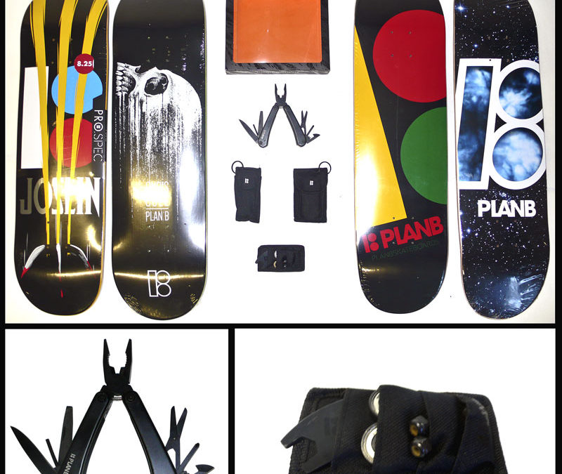 Als erstes kommt natürlich gleich ein ziemlich krasses Give-Away: Zu jedem regulären (nicht reduzierten) PLAN B Deck gibt es das PLAN B TOOL FIELD KIT im Wert von 24,90€ gratis dazu! Das Field Kit beinhaltet ein Multifunktionstool mit Zange, Schere, Dosenöffner, Kreuzschraubenzieher, Feile, Inbus (passend für Montageschrauben) und einem Messer mit passender Tasche und eine weitere Tasche mit einem Skateboardtool, zwei PLAN B Kugellagern, zwei Montageschrauben plus Mutter, Curbwax und zwei Achsmuttern!