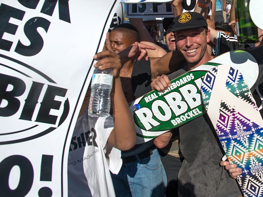 Über diese gute Neuigkeit wurde Robbie während seines Contest Runs beim PHX Amateur Contest informiert. Freunde und Familie stürmten auf den Parcour und hielten sein Pro Model Board in die Luft … coole Aktion von Real.