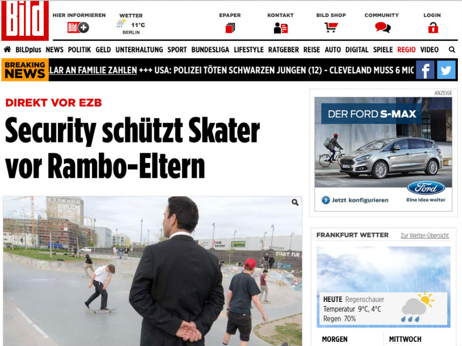 Die Überschrift der Bild, Security schützt Skater vor Rambo-Eltern, ist eindeutig.
