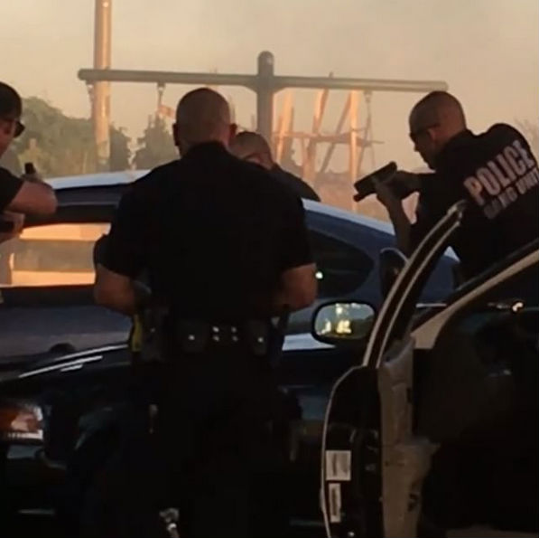 Und als hätte sich die Polizei mit den Skateboardern im Park abgesprochen, ramt ein Polizeiauto den Flüchtigen und verhaftet ihn mit gezogenen Waffen, direkt vor dem Skatepark, wo fast jeder Skateboarder mit einer Kamera/Handy bewaffnet ist.