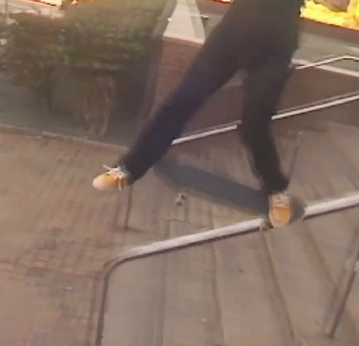 Wie krank ist das denn? 5-0 One Footed Grind … und zu allem Überfluss auch noch an einem Rail! Matt Tomasello ist irre: