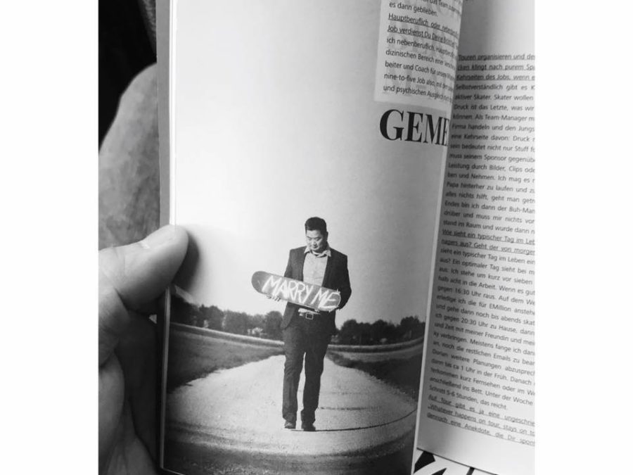 Ich habe mir überlegt, wie ich ihr einen ganz besonderen Antrag machen kann. Einen, den man nicht so schnell vergisst und woran wir uns immer erinnern. Ein Bild fand ich von der Idee her gut, allerdings war mir ein Bild alleine zu einfach. Nachdem Skateboarding seit über 25 Jahren ein Teil von mir ist, kam mir die Idee mit dem Board und dem Skateboard Magazin. Sozusagen das was ich liebe auf einem Bild zusammengefasst mit einer persönlichen Nachricht auf meinem EMillion Deck. Und dadurch, dass es in einem Magazin ist, haben wir etwas zum greifen und hoffentlich für die Ewigkeit. Ich finde das schöner als ein einfaches Bild in einem Bilderrahmen. Danke an Julius Lowsky, er hat das Bild geschossen!