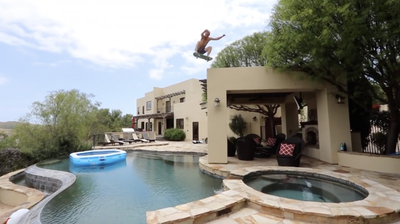 Und weil ein Video über Hustons Haus noch nicht reicht, sprang Garrett von dem Terrassendach in den Pool, inklusive Skateboard. Ich muss ja gestehen, mir gefällt persöhnlich Nyjahs Garage inkl. Autos am besten …