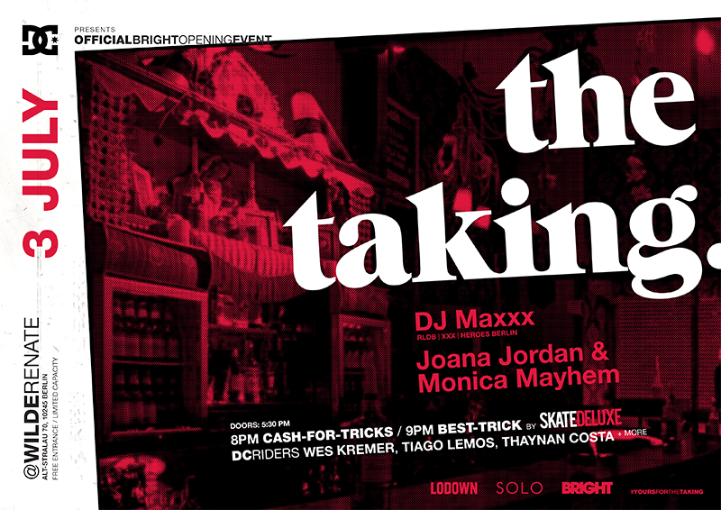 Am 03. Juli präsentieren DC Shoes und skatedeluxe gemeinsam: The Taking – das offizielle Eröffnungsevent der Bright Trade Show und verwandeln den Salon zur wilden Renate in einen offenen Skatepark.