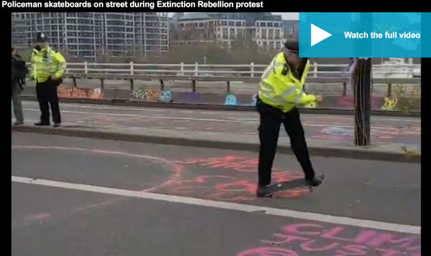 Auf Handyaufnahmen ist zu erkennen, wie einer der Polizisten während seiner Dienstzeit mit dem Skateboard auf der Waterloo Brücke skatet. Wobei der gute Mann etwas Übung vertragen könnte.