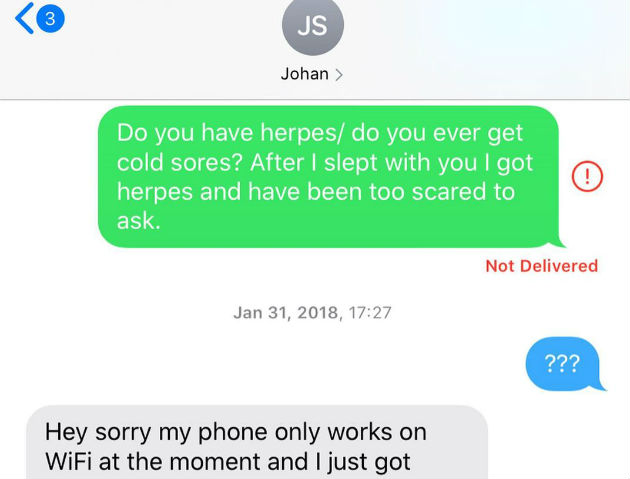 Eine Frau namens Emily hatte genug Mut und schrieb auf Instagram, wie Johan sie mit Genitalherpes angesteckt hat. Vor dem Beischlaf fragte die Frau Stuckey extra, ob er „sauber“ sei und ob er auf Geschlechtskrankheiten getestet sei. Stuckey versicherte ihr, dass er keine Probleme habe, keine Krankheit, und steckte schließlich die Frau an. In ihrem Posting spricht die Dame davon, wie schwer seitdem die Zeit für sie war und das sie sich bereits versucht hat, das Leben zu nehmen (den genauen Ablauf und alle Details werden unten in den Fotos aufgelistet).
