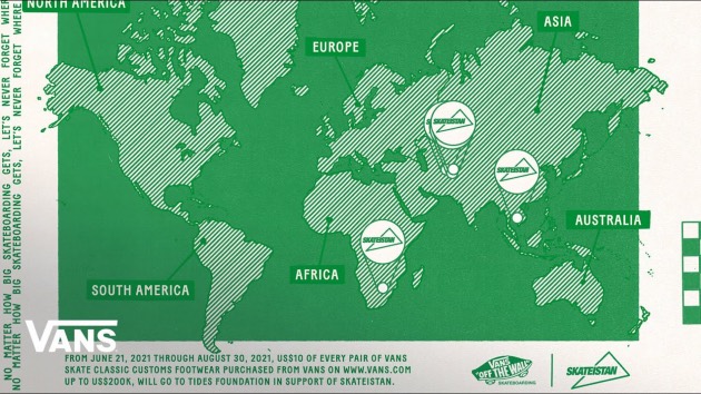 Bis September spendet Vans 10 USD von jedem Paar Vans Custom Skate Classics, die vom 21. Juni bis 30. August 2021 bei Vans auf Vans.com/customs gekauft wurden – bis zu 200.000 USD – an die Tides Foundation zur Unterstützung von Skateistan. Jeder wird in der Lage sein, sein eigenes einzigartiges Paar Vans Skate Classics zu kreieren und damit zu Ehren des Go Skateboarding Day einen guten Zweck etwas zurückzugeben.
