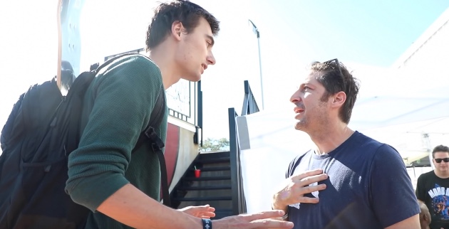 Der ehemalige Pro Fahrer und Gründer von the Berrics (zusammen mit Eric Kosten, mittlerweile ist die Webseite verkauft), schnappte sich den Besucher und stellte ihn vor laufender Kamera zu Rede. Warum er dieses Plakat gemacht habe, was daran lustig sei?