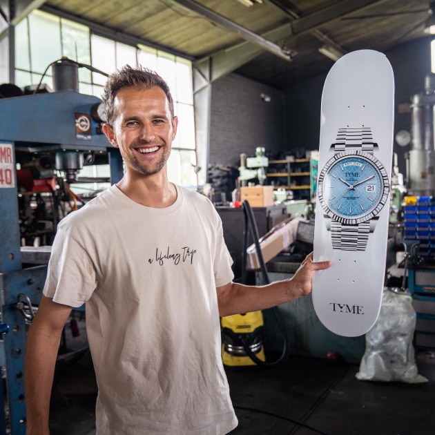 TYME Skateboards heißt die Company und wie man sieht, ist Mizrov mächtig stolz auf das erste Board Design. Neben Alex bilden noch Alex Ring und Karim Nassar das Team.