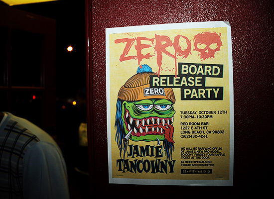 In der "Red Room" Bar in Long Beach, Kalifornien, feierte Jamie mit seiner Freundin, Mutter und Freunden sein Pro Model Board. Zu Besuch waren zum Beispiel Tancownys Chef Jamie Thomas, Pro Fahrer Tony Tave, Bakers Slash und viele andere.