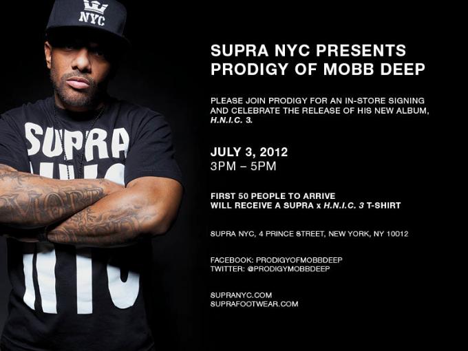 Supra: To kick off the collaboration with its new ambassador, Prodigy will take over SUPRA NYC, the New York City flagship store, today, July 3, to celebrate the release of his new album H.N.I.C 3. The brand new album will be available for purchase and Prodigy will be signing copies at SUPRA NYC from 3-5p.m. The first 50 people to arrive at SUPRA NYC on Tuesday will receive free SUPRA x H.N.I.C. 3 T-shirts.