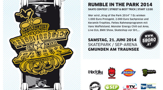 Wie allen Rumble Liebhabern seit Jahren bekannt, wird es auch heuer wieder ordentlich zur Sache gehen und der Park gerockt, wenn es wieder heißt: ,,VANS RUMBLE IN THE PARK 2013 presented by GETRÄNKE WAGNER – SKATECONTEST unterstützt von 5Boro, Dickies, Iriedaily, Alpine Stars, Monster Energy, Independent, Makia, Muckefuck, Super Tomorrow, Tips, Salzi.tv und Stadtgemeinde Gmunden.