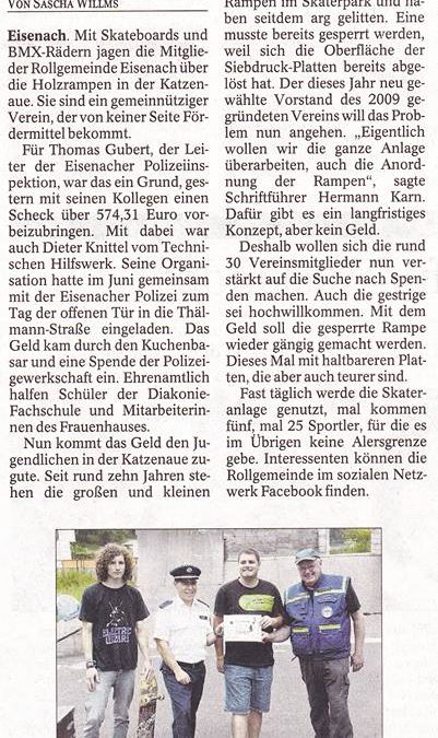 Normalerweise haben wir Skateboarder eher Probleme mit der Polizei als das wir uns gegenseitig in den Armen liegen. In Eisenach gibt es jedoch noch eine heile Welt. Wie dieser Zeitungsartikel zeigt, hat die örtliche Polizei zusammen mit dem THW einen Scheck in Höhe von 574,31€ an die Rollsportgemeinde Eisennach gespendet.