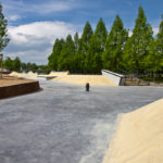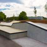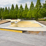Die Skateskulpturen aus farbigem Beton bestehen aus einer Bowl und zwei aufgehenden Skulpturen mit Bank, Curb- und Railkombinationen, die sich gestalterisch in die landschaftsarchitektonische Formensprache des Allerparks einfügen.