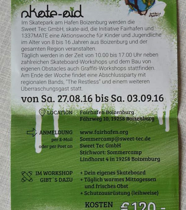 Anmeldungen zum skate-aid/ Sweet Tec GmbH Sommercamp Skateboard-Workshop 2016 sind ab jetzt auch online auf www.fairhafen.org möglich. Die Plätze sind sehr begrenzt!