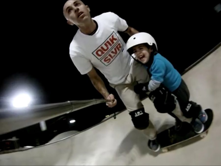Tandem Skateboarding, der Vater nimmt den Sohn auf sein Skateboard und flowt durch den Pool. Ab und zu steigt sogar die kleine Schwester auf das Board …
