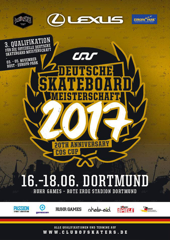 COS Cup – NRW Meisterschaft: Vom 16. bis um 18. Juni geht’s im Rahmen der Ruhr Games ins ehrwürdige Dortmunder Stadion Rote Erde, wo wir sowohl den Nordrhein- Westfälischen Meister küren als auch weitere Qualifikationsplätze für die offizielle Deutsche Meisterschaft im Skateboarden am Start haben werden. Das Ganze inklusive ordentlichem Festival-Feeling mit top Musik –Acts, wie unter anderem Sportfreunde Stiller, Chefket und Clueso.