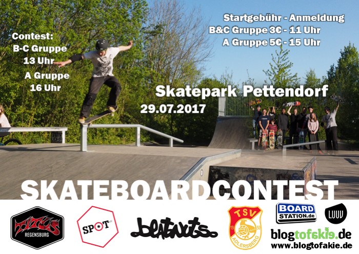 Contest im Skatepark Pettendorf – A, B, und C Gruppe 26. Juni 2017 12:55 - Johannes Gausepohl Im Skatepark von Pettendorf findet ein Contest statt. Für alle Infos checkt bitte den Flyer.