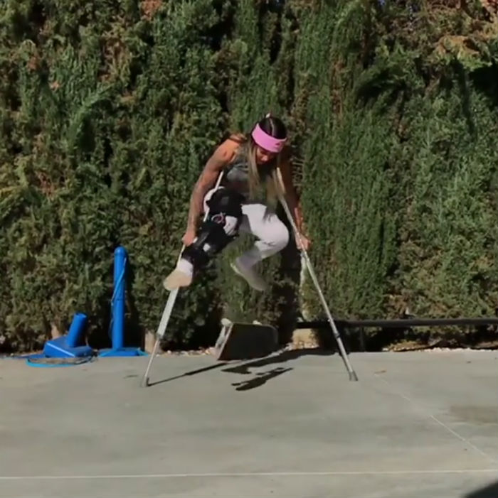 Leticia erwartet in ungefähr 4 Wochen wieder auf dem Board stehen können. Wie man an diesem Foto sieht, ist sie schon wieder wohl auf, und gönnt sich trotz Knie OP Kickflips …