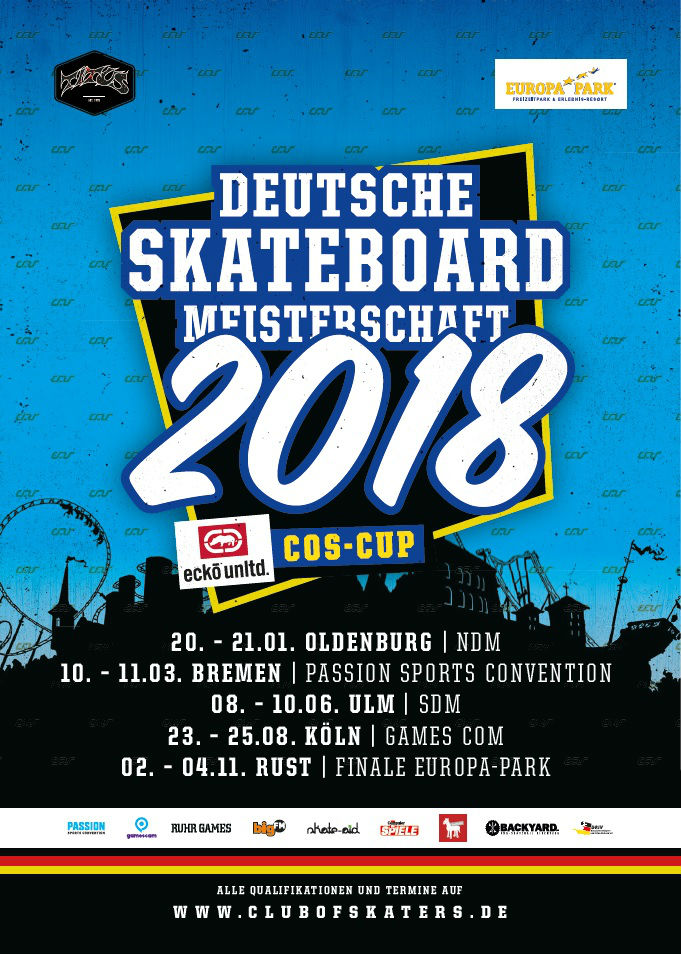 Kaum hat sich Jost Arens den Deutschen Meister titel gesichert, steht schon das nächste Jahr und damit nicht n ur die neue Skateboarding – Saison , sondern auch der Start in die dritte Dekade des COS Cups vor der Tür. Denn auch 2018 wird im Rahmen der größten jährlichen Contest – Serie Europas nach dem offiziellen Deutschen Meist er im Skateboarden gesucht.