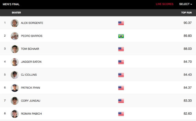 Bei den Männer wurde es in den Finals sehr spannende. Pedro Barros aus Brasilien und Alex Sorgente aus den USA kämpfen bis zum bitteren Ende um den Sieg und überboten jedes mal den vorangegangen Run des Gegners. Am Ende konnte sich Sorgente den Sieg sichern und verwies Barros (Gerüchte über neuen Boardsponsor)auf den zweiten Platz. Tom Schaar war nach einer kurzen Verletzungsauszeit wieder im Contestzirkus zurück und schnappte sich Platz 3.