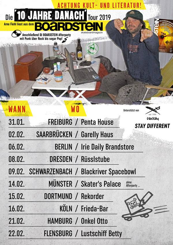 Es ist ziemlich genau zehn Jahre her, daß wir unser geliebtes BOARDSTEIN Magazin einstellen mußten, deswegen gibt es jetzt, zehn Jahre danach, die ’10 Jahre danach‘ Lesungstour von und mit DJ BOARDSTEIN aka ehemaliger Chefredakteur aka Arne Fiehl.