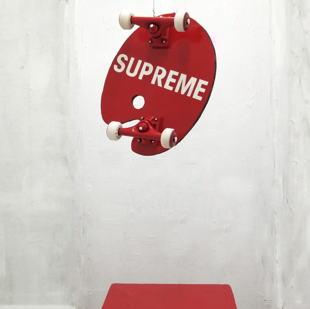 Adrian hatte ein Stück Holz genommen, es rot angemalt, zwei Achsen mit Rollen und Kugellagern unter die Planke geschraubt und den Namen „Supreme“ in weißer Farbe auf die Unterseite geschrieben – fertig war das Kunstwerk.