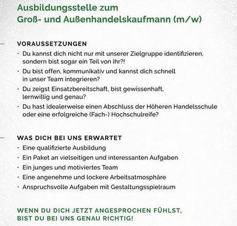 Wir bieten zum 01.08.2019 eine Ausbildungsstelle zum Groß- und Außenhandelskaufmann (m/w).