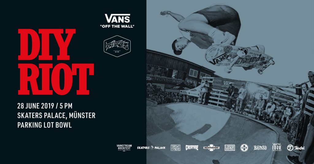 Zum mittlerweile 6. Mal findet parallel zum „Vainstream-Kick-Off“ im Skaters Palace am Freitag, den 28.06.2019 der DIY Riot am Parkplatz-Bowl in Münster statt. Was als kleiner lokaler Event kurz nach der Fertigstellung der Betonschüssel 2014 begann, hat sich in den letzten Jahren zu einem Event der Extraklasse entwickelt. Mit Einführung des Barrell-Jumps 2017, dem Death-Race und „Feueraction“ an wechselnden Spots werden auch nicht-skatende Zuschauer jährlich zu begeisterten Fans.