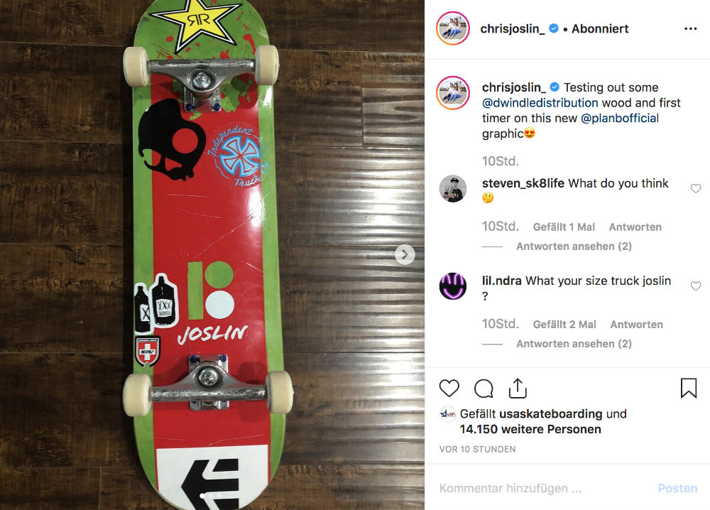 Plan-B Skateboards Pro Chris Joslin (Etnies, Grizzly Griptape, Independent Trucks) testet neues „Holz“ bei seinen Brettern. Das klingt unspektakulär, heizt aber die Gerüchte über Plan-B Skateboards und Dwindle Distribution an.