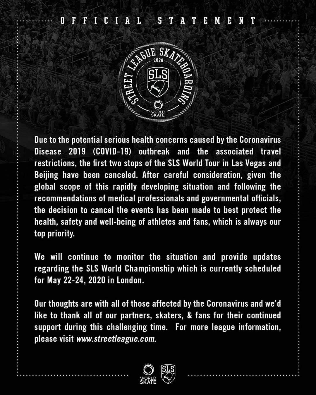 zurück zum ArtikelCorona Virus – Street League sagt SLS World Tour in Las Vegas und Beijing ab. 13. März 2020 06:15 - Johannes Gausepohl