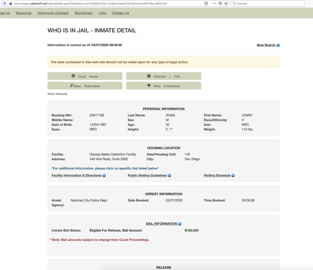Genauere Informationen kann man in der Datenbank „Who is in Jail“ vom San Diego Sheriff Department finden. Die Daten sind für jeden frei zugänglich.