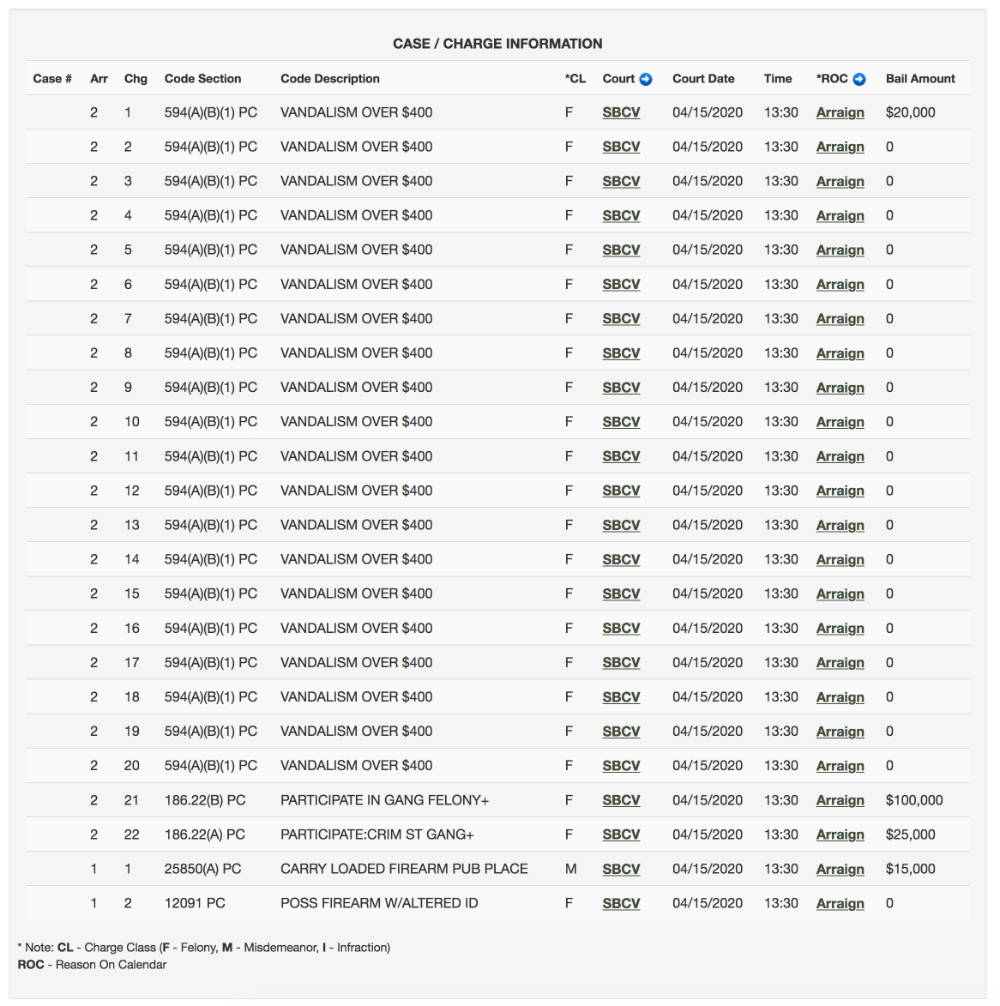 Seine Kaution wurde auf Grund der Gangbeteiligung und des Waffenbesitzes auf 160.000 US-Dollar festgelegt. Für die 20 Graffiti-Vergehen wären nur 20.000 US-Dollar fällig gewesen.