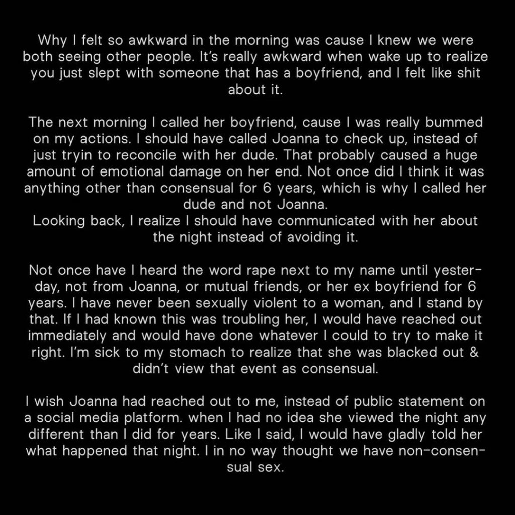 Grundsätzlich weißt Figgy jeglichen Anschuldigung, dass der Sex nicht einvernehmlich war, von sich. Auch habe Joanna ihn zu sich eingeladen, nicht umgekehrt noch habe er sie dazu gezwungen.