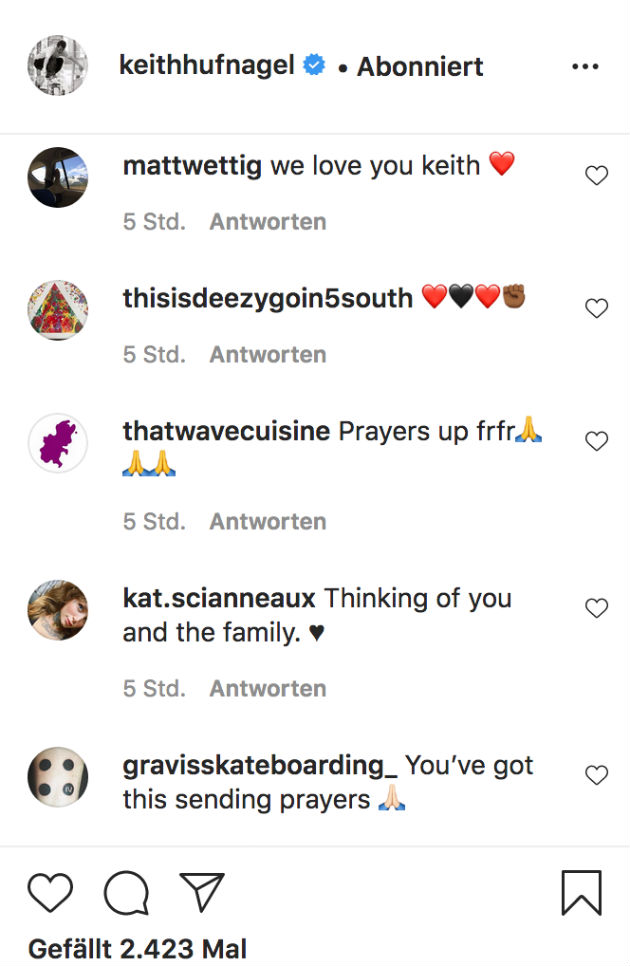 Vor ungefähr fünf Stunden fingen die ersten Fans und Freunde von Keith „HUF“ Hufnagel an, für ihn zu beten. Über Instagram schicken viele Genesungswünsche.
