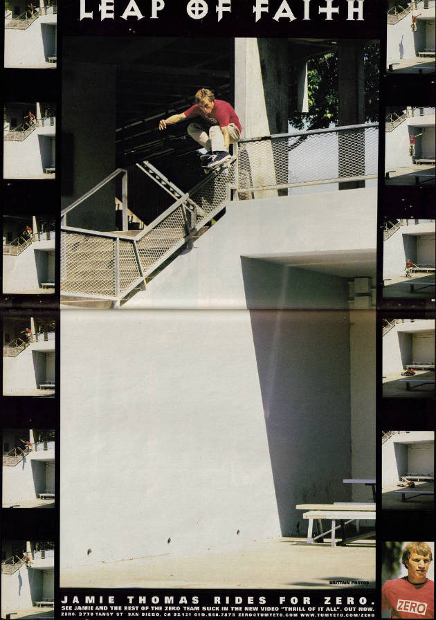 1997 schockte Zero Skateboards Boss Jamie Thomas die Skateboardwelt. Er versuchte ein gigantisches Gap, das später den Namen Leap Of Faith bekam, zu meistern. Leider, leider waren die mehr als 5 Meter Tiefe zu viel. Jamie schaffte zwar die Landung, aber er rollte danach nicht weiter, sein Board brach in der Mitte durch.