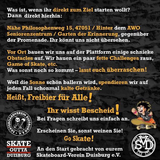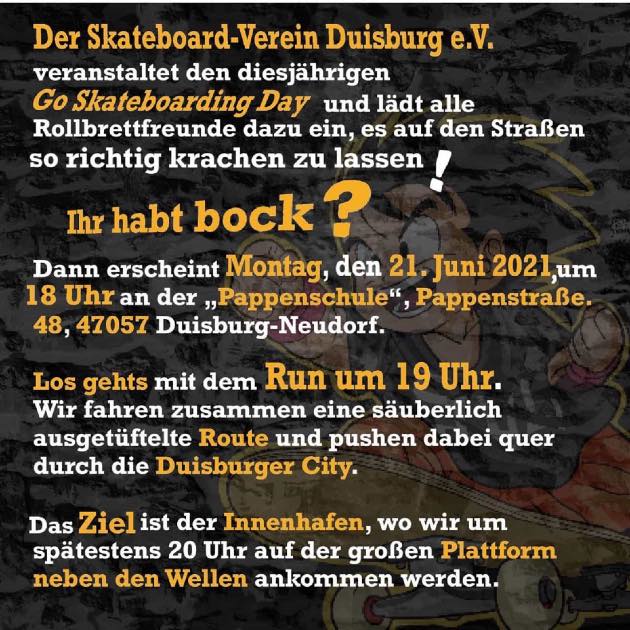 Der Skateboardverein Duisburg hat mir gerade die Informationen zum diesjährigen GO SKATEBOARDING DAY geschickt. Checkt die Infos zum internationalen „Skateboard-Feiertag“: