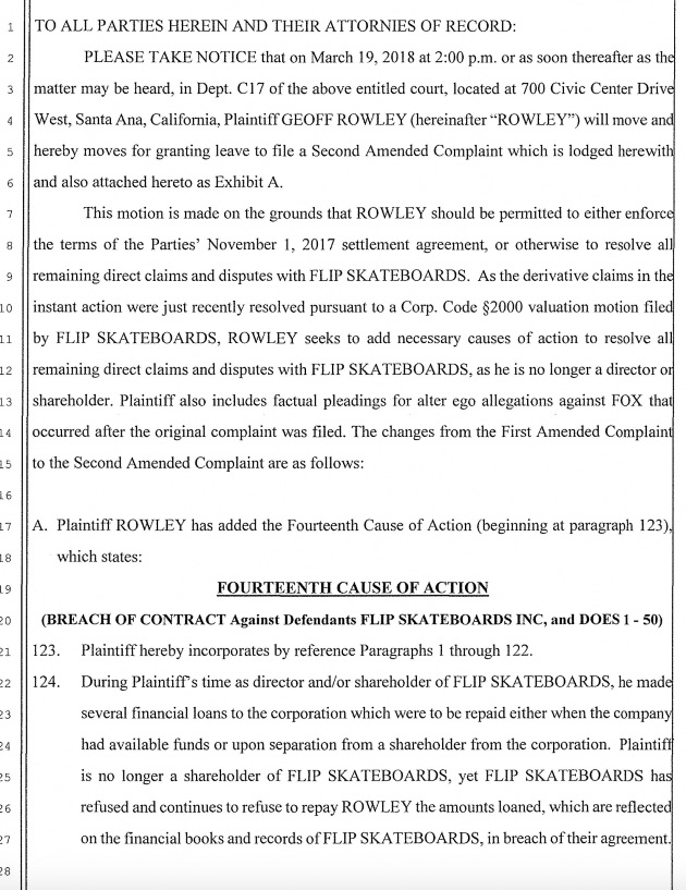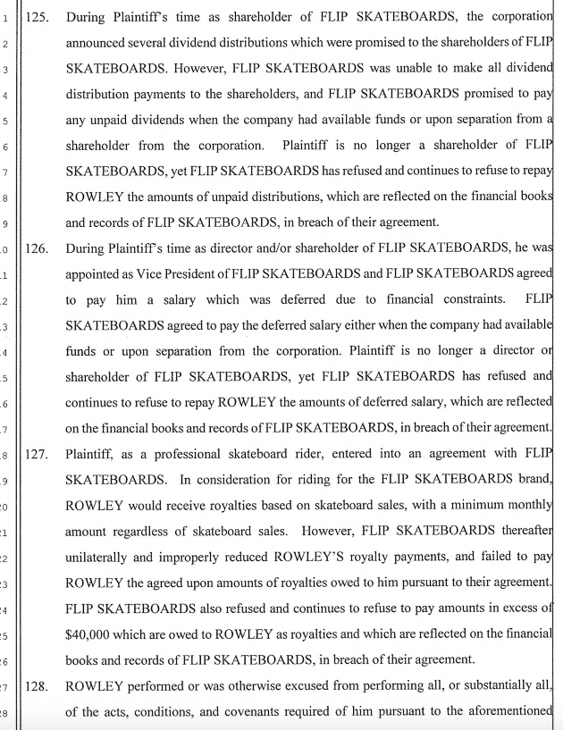 Jedenfalls zeigen die Dokumente im Anschluss, dass Rowley und Flip Skateboards über Geld streiten bzw. in der Vergangenheit eine Meinungsverschiedenheit zu dem Thema hatten. Rowley hatte Flip Geld geliehen und bekam es (laut seinen Aussagen) nicht zurück, außerdem sollte er als Teamfahrer ein Gehalt bekommen was er aber nicht bekommen haben soll und auch Anteile aus den Boardverkäufen kamen angeblich nie korrekt bei ihm auf dem Konto an.