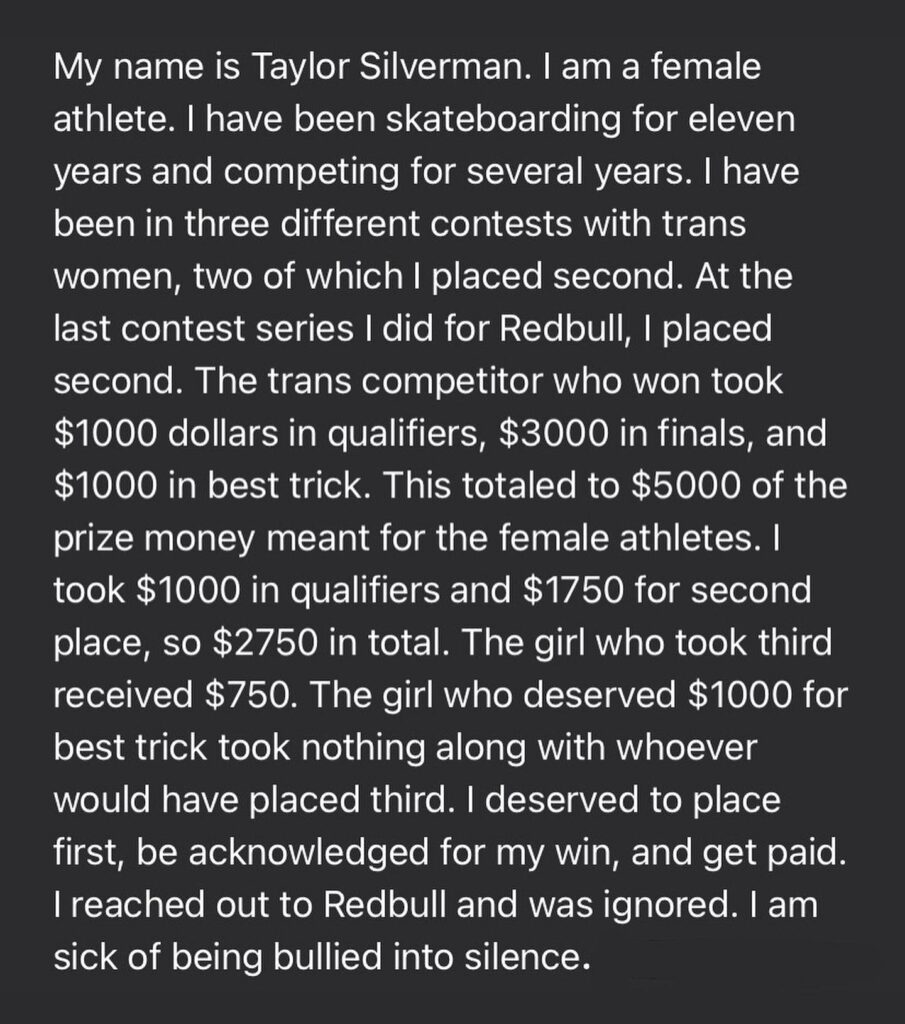 Ein biologischer Mann mit einem klaren Vorteil gewann die Woman Division, den Best Trick und gewann zahlreiche Qualifikationen. Dies nahm den Frauen die Gelegenheit, einen Contest zu gewinnen und Geld zu verdienen.